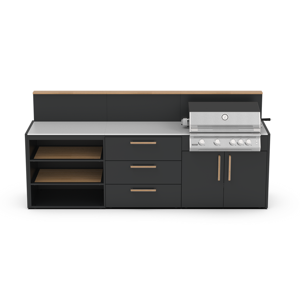 Η στιβαρότητα της κατασκευής εξασφαλίζεται από τον σκελετό γαλβανισμένου χάλυβα με διπλή ηλεκτροστατική βαφή, προσφέροντας κορυφαία αντιδιαβρωτική προστασία ακόμα και σε απαιτητικά περιβάλλοντα. Η KC-C035 είναι εξοπλισμένη με πολυάριθμους αποθηκευτικούς χώρους και συρτάρια που ενσωματώνουν μηχανισμούς Soft Close για αθόρυβη λειτουργία. Περιλαμβάνει ειδική υποδοχή για την εντοίχιση της ψησταριάς, χώρο για νεροχύτη και έξυπνη απόκρυψη της φιάλης αερίου, συνδυάζοντας την επαγγελματική απόδοση με ένα minimal αρχιτεκτονικό στυλ που αναβαθμίζει κάθε σύγχρονη βεράντα ή κήπο.