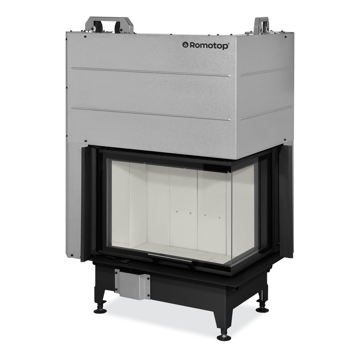 Το γωνιακό τζάμι (αριστερό ή δεξί) αποτελείται από δύο μέρη, ενώ η ομαλή, αθόρυβη και ακριβής λειτουργία της πόρτας εξασφαλίζεται από το προηγμένο σύστημα SILENT LIFT. Ο θάλαμος καύσης επενδύεται είτε με το ανθεκτικό υλικό IGNITON είτε με μαύρα πυρίμαχα chamotte και είναι σχεδιασμένος χωρίς σχάρα καύσης, με δυνατότητα προσθήκης κατόπιν επιλογής.